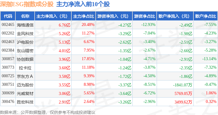 资金流向方面,深指ESG(970026)指数成份股当日主力资金净流出合计167.28亿元,游资资金净流入合计33.01亿元,散户资金净流入合计134.27亿元。成份股资金流向详情见下表: