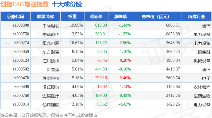 证券之星消息,12月29日,创指ESG增强(970034)指数报收于3066.42点,跌1.16%,成交1212.9亿元,换手率2.15%。当日该指数成份股中,上涨的有13家,迈为股份以20.0%的涨幅领涨,下跌的有27家,欣旺达以11.39%的跌幅领跌。