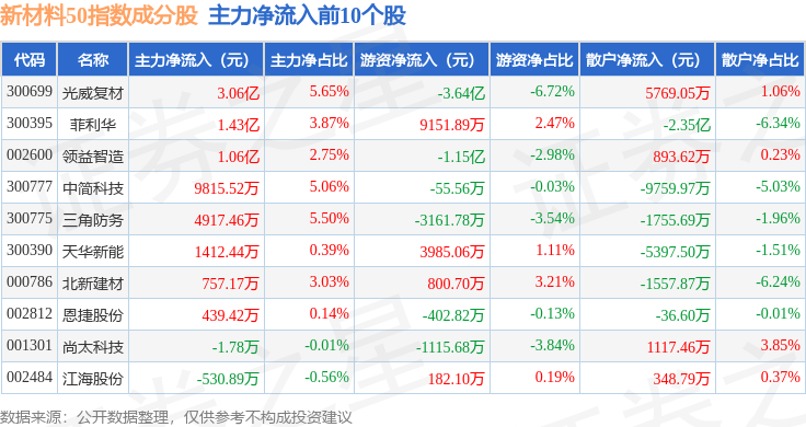 资金流向方面,新材料50(970042)指数成份股当日主力资金净流出合计65.34亿元,游资资金净流入合计10.22亿元,散户资金净流入合计55.12亿元。成份股资金流向详情见下表: