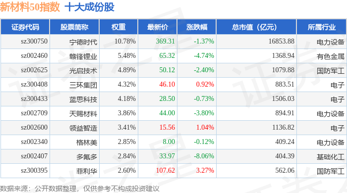 证券之星消息,12月29日,新材料50(970042)指数报收于3812.46点,跌1.32%,成交860.47亿元,换手率3.12%。当日该指数成份股中,上涨的有16家,光威复材以14.86%的涨幅领涨,下跌的有33家,多氟多以8.06%的跌幅领跌。