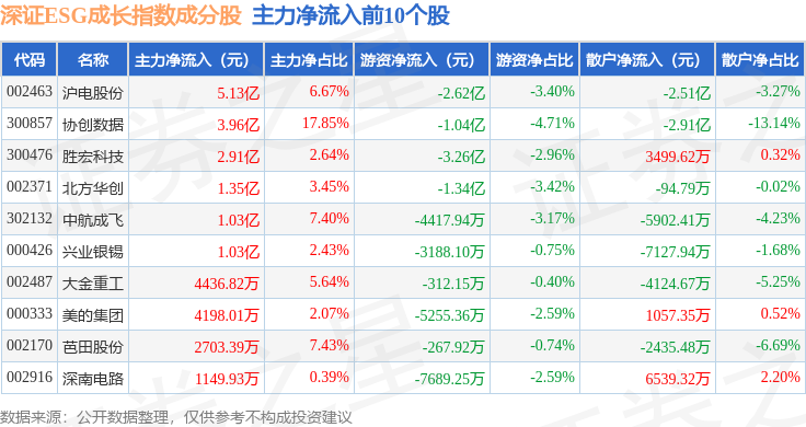 资金流向方面,深证ESG成长(970060)指数成份股当日主力资金净流出合计41.19亿元,游资资金净流入合计14.52亿元,散户资金净流入合计26.66亿元。成份股资金流向详情见下表:
