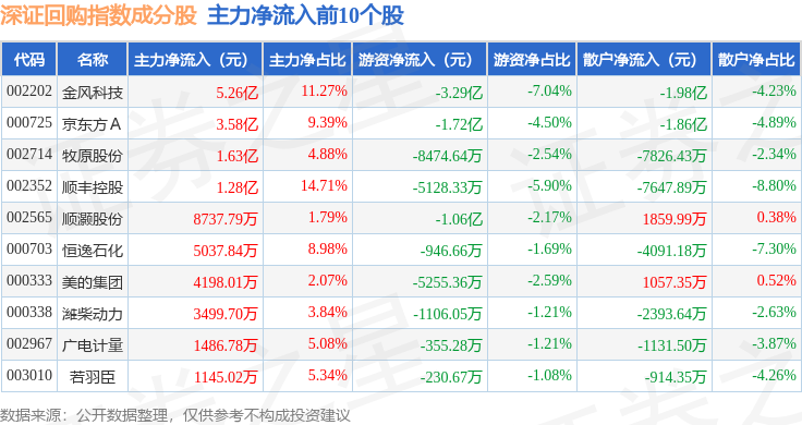 资金流向方面,深证回购(970063)指数成份股当日主力资金净流出合计5.07亿元,游资资金净流出合计1.64亿元,散户资金净流入合计6.71亿元。成份股资金流向详情见下表: