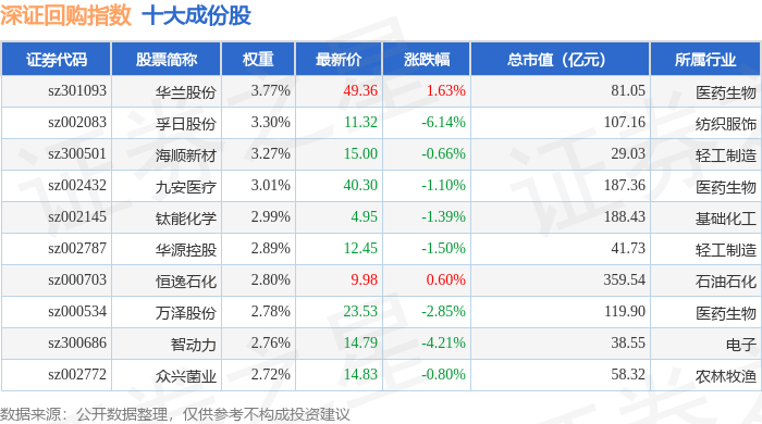 深证回购(970063)指数十大成份股详情如下: