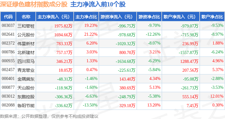 资金流向方面,深证绿色建材(970077)指数成份股当日主力资金净流出合计3.5亿元,游资资金净流入合计8997.6万元,散户资金净流入合计2.6亿元。成份股资金流向详情见下表: