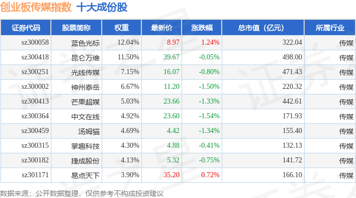 证券之星消息,12月29日,创业板传媒(970084)指数报收于1264.73点,跌0.61%,成交135.13亿元,换手率3.59%。当日该指数成份股中,上涨的有8家,海看股份以3.18%的涨幅领涨,下跌的有33家,读客文化以4.02%的跌幅领跌。