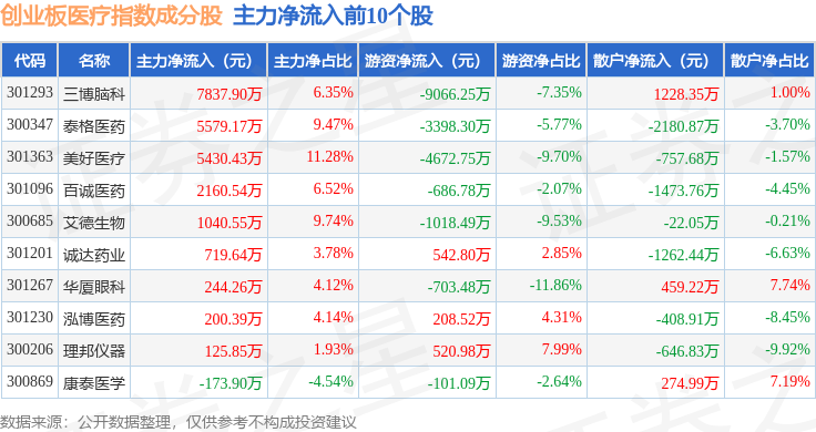 资金流向方面,创业板医疗(970082)指数成份股当日主力资金净流出合计3.29亿元,游资资金净流出合计548.16万元,散户资金净流入合计3.34亿元。成份股资金流向详情见下表: