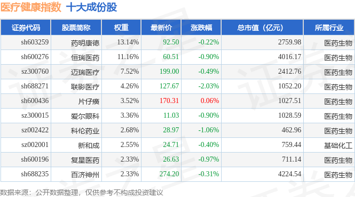 资金流向方面,医疗健康(980016)指数成份股当日主力资金净流出合计15.06亿元,游资资金净流入合计7.21亿元,散户资金净流入合计7.85亿元。成份股资金流向详情见下表: