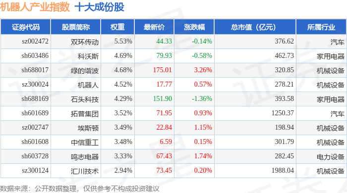 证券之星消息,12月29日,机器人产业(980022)指数报收于2554.34点,涨1.3%,成交466.31亿元,换手率2.98%。当日该指数成份股中,上涨的有36家,步科股份以20.0%的涨幅领涨,下跌的有14家,奥普光电以3.12%的跌幅领跌。