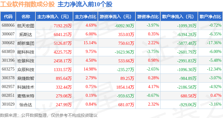 资金流向方面,工业软件(980034)指数成份股当日主力资金净流出合计8.8亿元,游资资金净流入合计1.54亿元,散户资金净流入合计7.25亿元。成份股资金流向详情见下表: