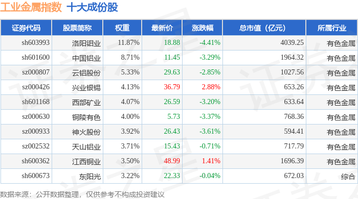 资金流向方面,工业金属(980043)指数成份股当日主力资金净流出合计37.45亿元,游资资金净流出合计3504.78万元,散户资金净流入合计37.8亿元。成份股资金流向详情见下表: