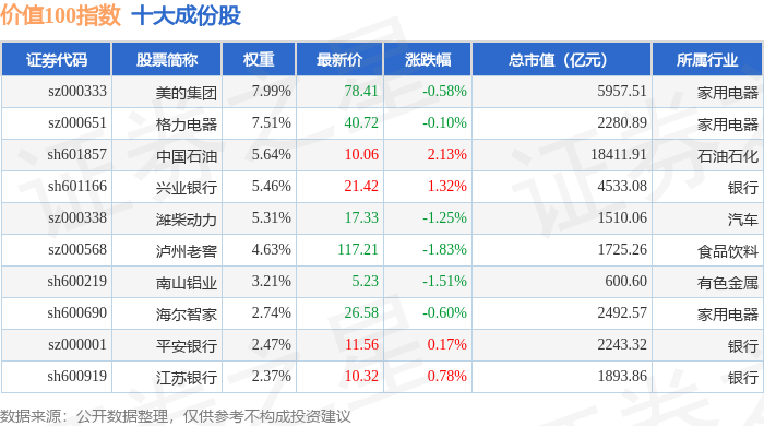 证券之星消息,12月29日,价值100(980081)指数报收于4408.01点,跌0.12%,成交469.18亿元,换手率0.64%。当日该指数成份股中,上涨的有33家,景津装备以4.12%的涨幅领涨,下跌的有59家,常宝股份以3.41%的跌幅领跌。