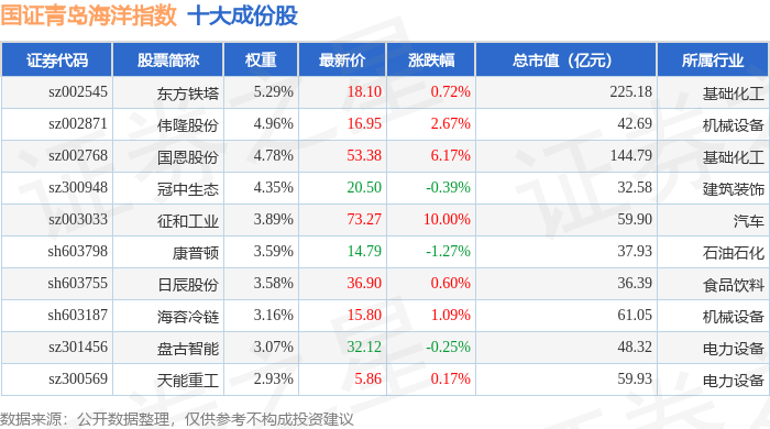 国证青岛海洋(980532)指数十大成份股详情如下: