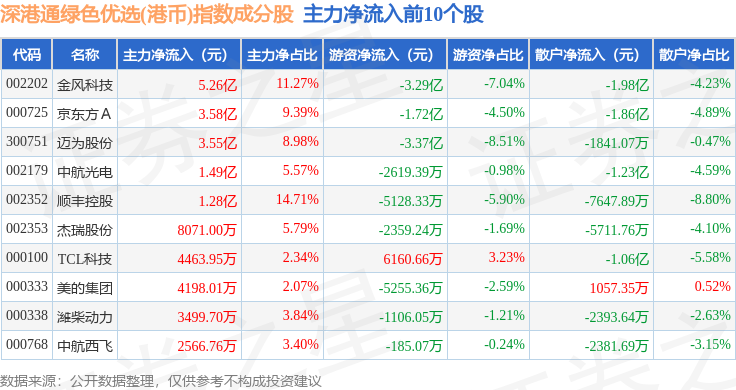 资金流向方面,深港通绿色优选(港币)(983012)指数成份股当日主力资金净流出合计14.4亿元,游资资金净流出合计1.82亿元,散户资金净流入合计16.21亿元。成份股资金流向详情见下表: