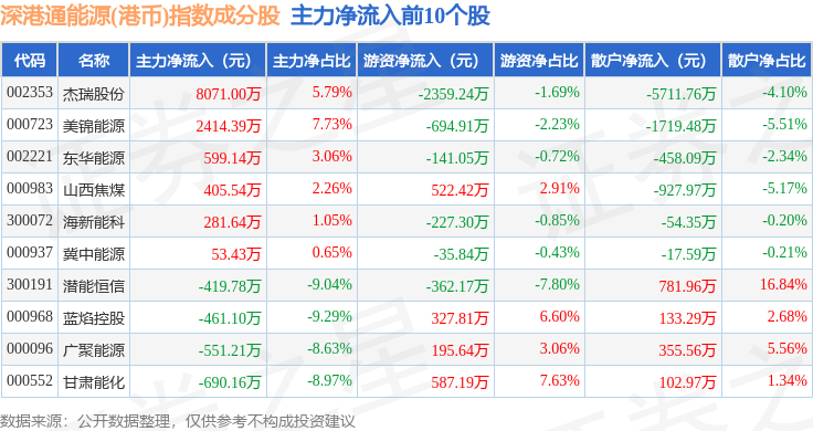 资金流向方面,深港通能源(港币)(983014)指数成份股当日主力资金净流入合计4581.77万元,游资资金净流出合计916.96万元,散户资金净流出合计3664.81万元。成份股资金流向详情见下表: