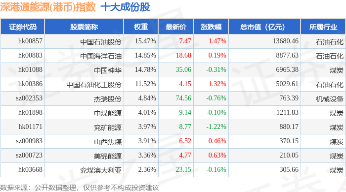 深港通能源(港币)(983014)指数十大成份股详情如下: