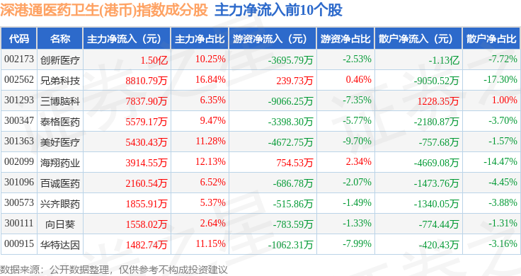 资金流向方面,深港通医药卫生(港币)(983024)指数成份股当日主力资金净流出合计25.54亿元,游资资金净流入合计6.47亿元,散户资金净流入合计19.07亿元。成份股资金流向详情见下表: