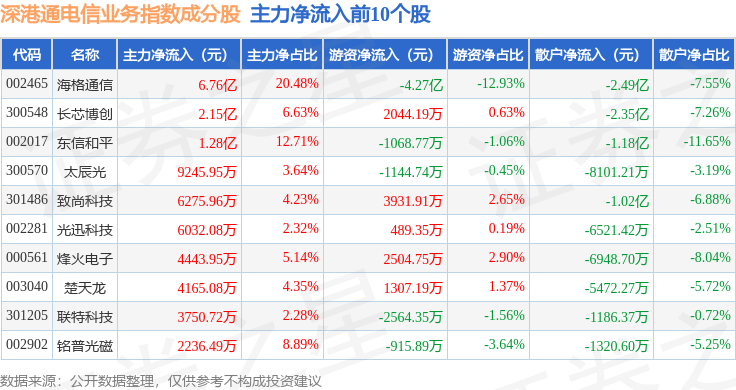 资金流向方面,深港通电信业务(983029)指数成份股当日主力资金净流出合计52.2亿元,游资资金净流入合计27.11亿元,散户资金净流入合计25.1亿元。成份股资金流向详情见下表: