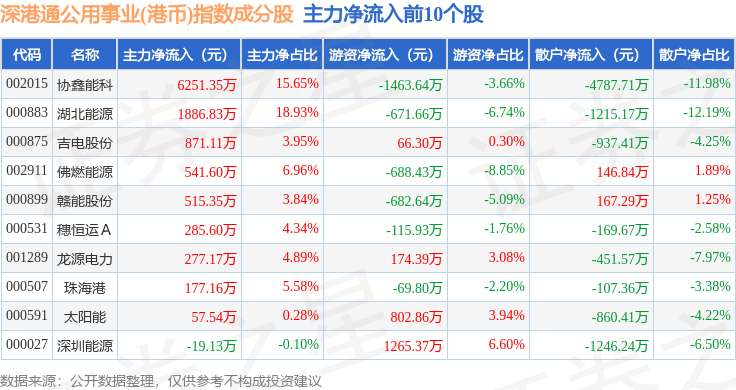 资金流向方面,深港通公用事业(港币)(983032)指数成份股当日主力资金净流出合计5.93亿元,游资资金净流入合计3.18亿元,散户资金净流入合计2.75亿元。成份股资金流向详情见下表: