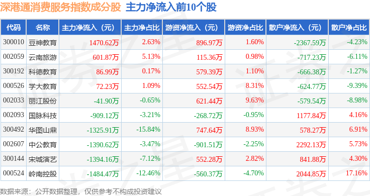 资金流向方面,深港通消费服务(983045)指数成份股当日主力资金净流出合计3.01亿元,游资资金净流入合计1918.89万元,散户资金净流入合计2.82亿元。成份股资金流向详情见下表: