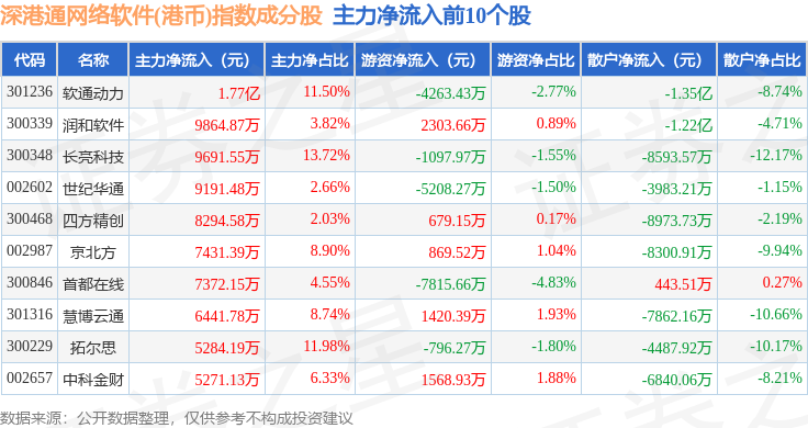 资金流向方面,深港通网络软件(港币)(983048)指数成份股当日主力资金净流出合计15.1亿元,游资资金净流入合计3.36亿元,散户资金净流入合计11.75亿元。成份股资金流向详情见下表: