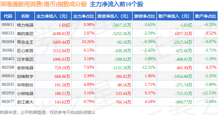 资金流向方面,深港通耐用消费(港币)(983050)指数成份股当日主力资金净流出合计7.32亿元,游资资金净流出合计8465.87万元,散户资金净流入合计8.16亿元。成份股资金流向详情见下表: