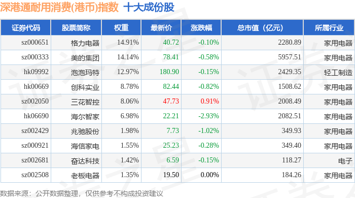 深港通耐用消费(港币)(983050)指数十大成份股详情如下: