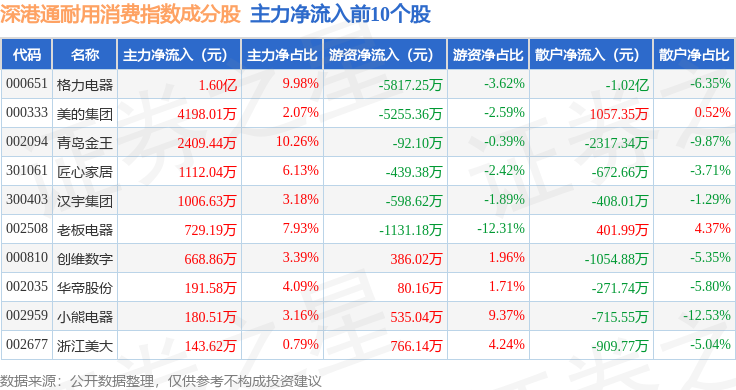 资金流向方面,深港通耐用消费(983049)指数成份股当日主力资金净流出合计7.32亿元,游资资金净流出合计8465.87万元,散户资金净流入合计8.16亿元。成份股资金流向详情见下表: