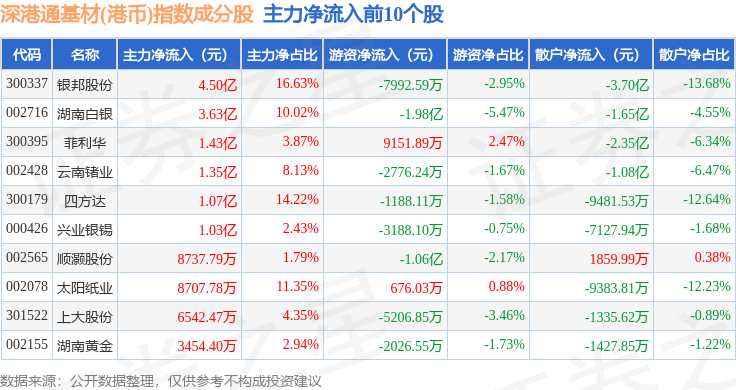 资金流向方面,深港通基材(港币)(983062)指数成份股当日主力资金净流出合计50.9亿元,游资资金净流入合计3271.96万元,散户资金净流入合计50.57亿元。成份股资金流向详情见下表: