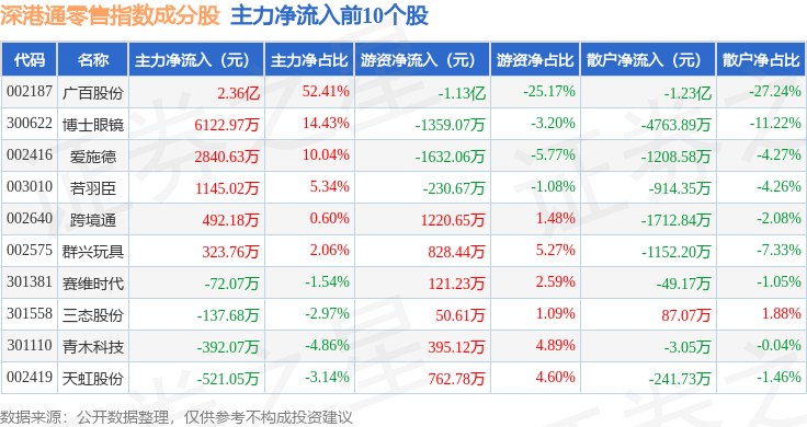 资金流向方面,深港通零售(983073)指数成份股当日主力资金净流出合计1.8亿元,游资资金净流出合计4657.24万元,散户资金净流入合计2.27亿元。成份股资金流向详情见下表: