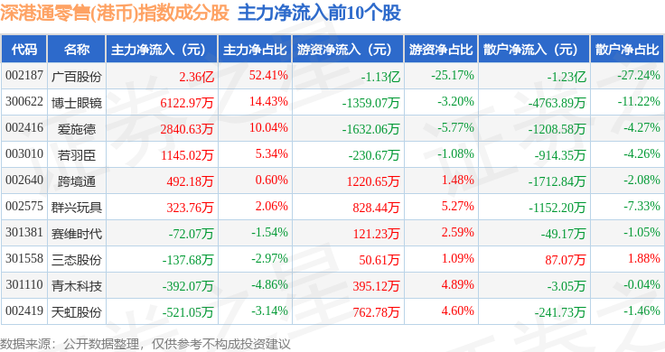 资金流向方面,深港通零售(港币)(983074)指数成份股当日主力资金净流出合计1.8亿元,游资资金净流出合计4657.24万元,散户资金净流入合计2.27亿元。成份股资金流向详情见下表: