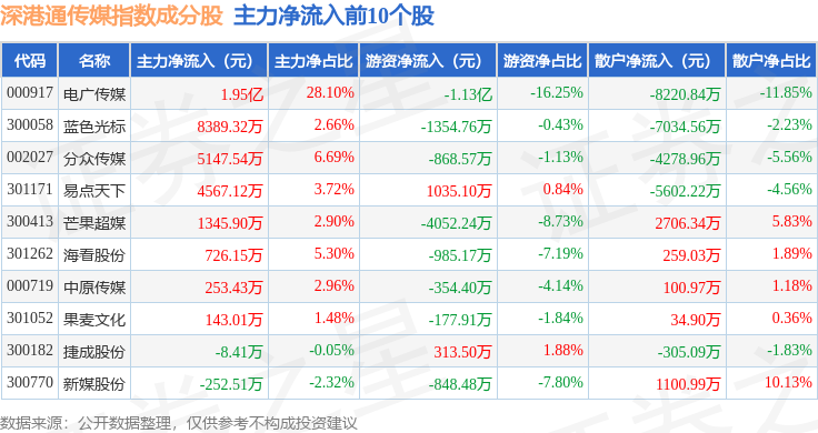 资金流向方面,深港通传媒(983075)指数成份股当日主力资金净流出合计7.4亿元,游资资金净流出合计4338.67万元,散户资金净流入合计7.84亿元。成份股资金流向详情见下表: