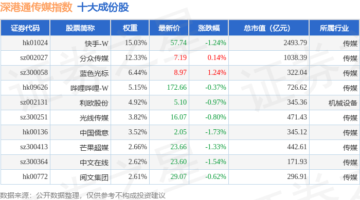 深港通传媒(983075)指数十大成份股详情如下: