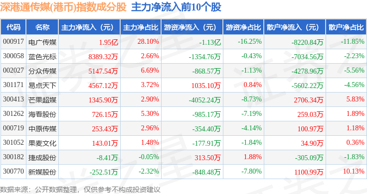 资金流向方面,深港通传媒(港币)(983076)指数成份股当日主力资金净流出合计7.4亿元,游资资金净流出合计4338.67万元,散户资金净流入合计7.84亿元。成份股资金流向详情见下表: