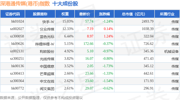 深港通传媒(港币)(983076)指数十大成份股详情如下: