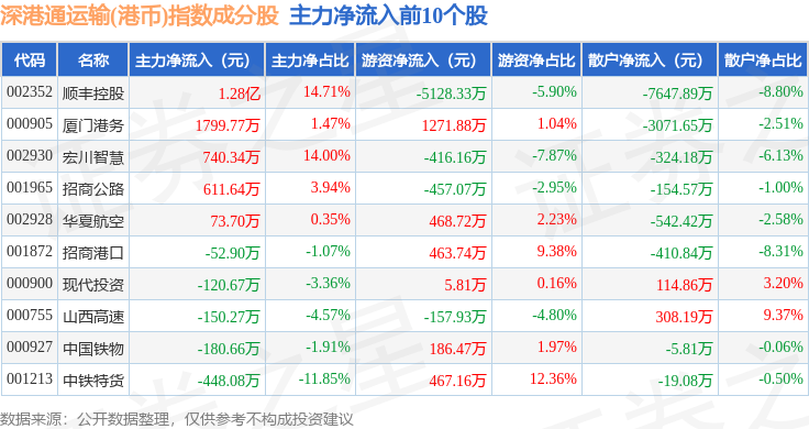资金流向方面,深港通运输(港币)(983078)指数成份股当日主力资金净流出合计2.97亿元,游资资金净流入合计5073.63万元,散户资金净流入合计2.46亿元。成份股资金流向详情见下表:
