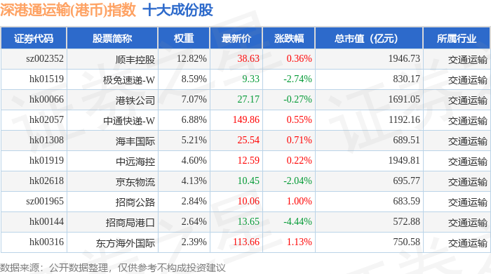 深港通运输(港币)(983078)指数十大成份股详情如下: