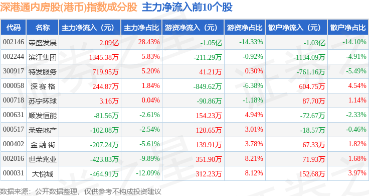 资金流向方面,深港通内房股(港币)(983084)指数成份股当日主力资金净流出合计2.07亿元,游资资金净流入合计5339.1万元,散户资金净流入合计1.53亿元。成份股资金流向详情见下表: