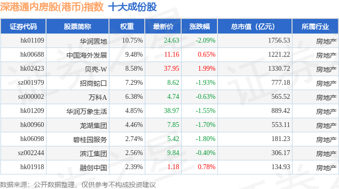 深港通内房股(港币)(983084)指数十大成份股详情如下: