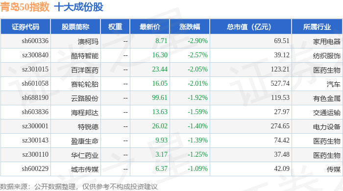 证券之星消息,12月29日,青岛50(989011)指数报收于2378.12点,跌0.3%,成交91.6亿元,换手率1.73%。当日该指数成份股中,上涨的有16家,征和工业以10.0%的涨幅领涨,下跌的有25家,澳柯玛以2.9%的跌幅领跌。