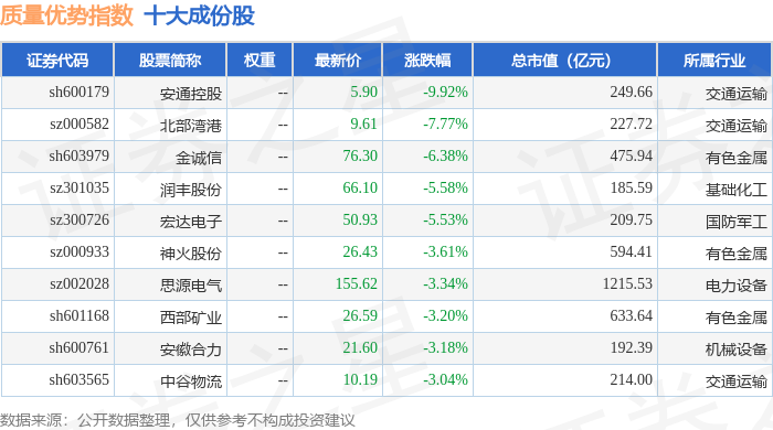证券之星消息,12月29日,质量优势(989017)指数报收于8038.0点,跌0.85%,成交646.81亿元,换手率1.38%。当日该指数成份股中,上涨的有21家,锐捷网络以6.87%的涨幅领涨,下跌的有79家,安通控股以9.92%的跌幅领跌。