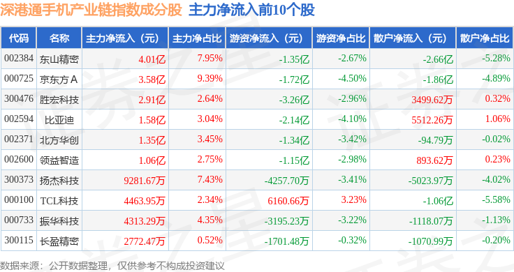 资金流向方面,深港通手机产业链(983009)指数成份股当日主力资金净流出合计12.14亿元,游资资金净流出合计5.98亿元,散户资金净流入合计18.12亿元。成份股资金流向详情见下表: