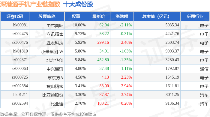 深港通手机产业链(983009)指数十大成份股详情如下:
