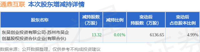 证券之星消息,12月29日通鼎互联发布公告《通鼎互联:关于原持股5%以上股东减持计划实施完成的公告》,其股东东吴创业投资有限公司-苏州市吴企创基股权投资合伙企业(有限合伙)于2025年12月19日至2025年12月26日间合计减持13.32万股,占公司目前总股本的0.0108%,变动期间该股股价下跌2.61%,截止12月26日收盘报6.34元。