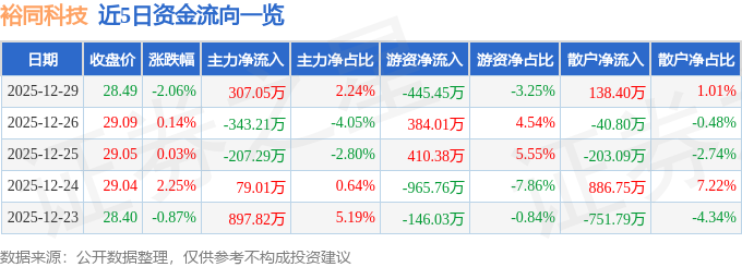 12月29日的资金流向数据方面,主力资金净流入307.05万元,占总成交额2.24%,游资资金净流出445.45万元,占总成交额3.25%,散户资金净流入138.4万元,占总成交额1.01%。