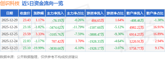证券之星消息,截至2025年12月29日收盘,创识科技(300941)报收于23.43元,上涨1.17%,换手率12.0%,成交量12.75万手,成交额2.96亿元。