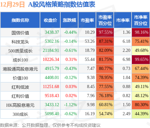 风格策略指数方面,国信价值的市盈率百分位较高,为97.55%。而300成长的市盈率百分位较低,为54.74%。