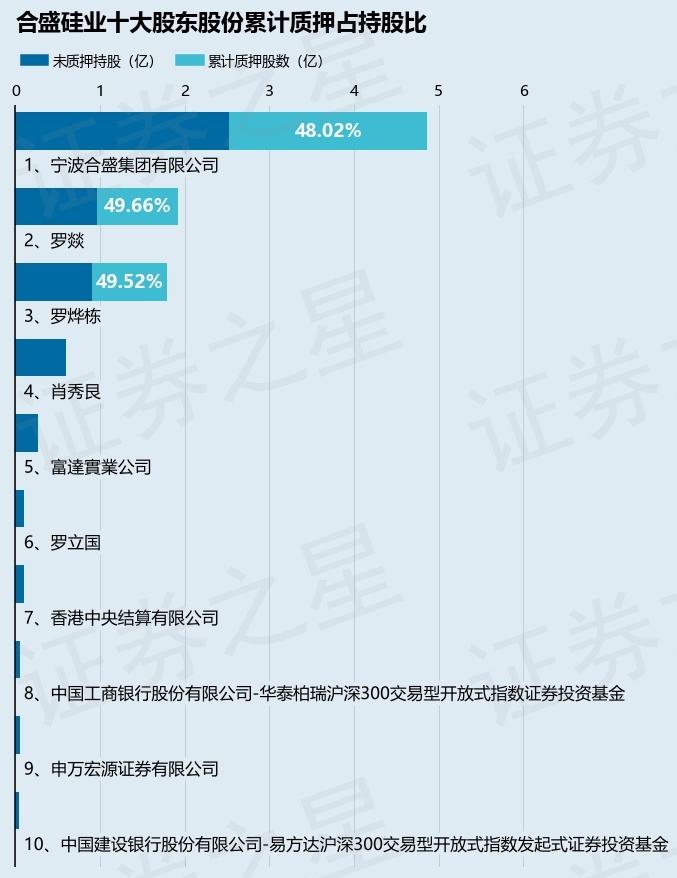 截止本公告日,股东宁波合盛集团有限公司已累计质押股份2.34亿股,占其持股总数的48.02%,股东罗燚已累计质押股份9560.06万股,占其持股总数的49.66%,股东罗烨栋已累计质押股份8884.35万股,占其持股总数的49.52%。本次质押后合盛硅业十大股东的累计质押股份占持股比例(占持股比例的计算以公司最新一期财务报表公布的十大股东的持股总数为基准)见下图: