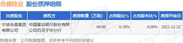证券之星消息,合盛硅业(603260)12月30日公开信息显示,股东宁波合盛集团有限公司向中国建设银行股份有限公司石河子市分行合计质押90.0万股,占总股本0.08%。质押详情见下表: