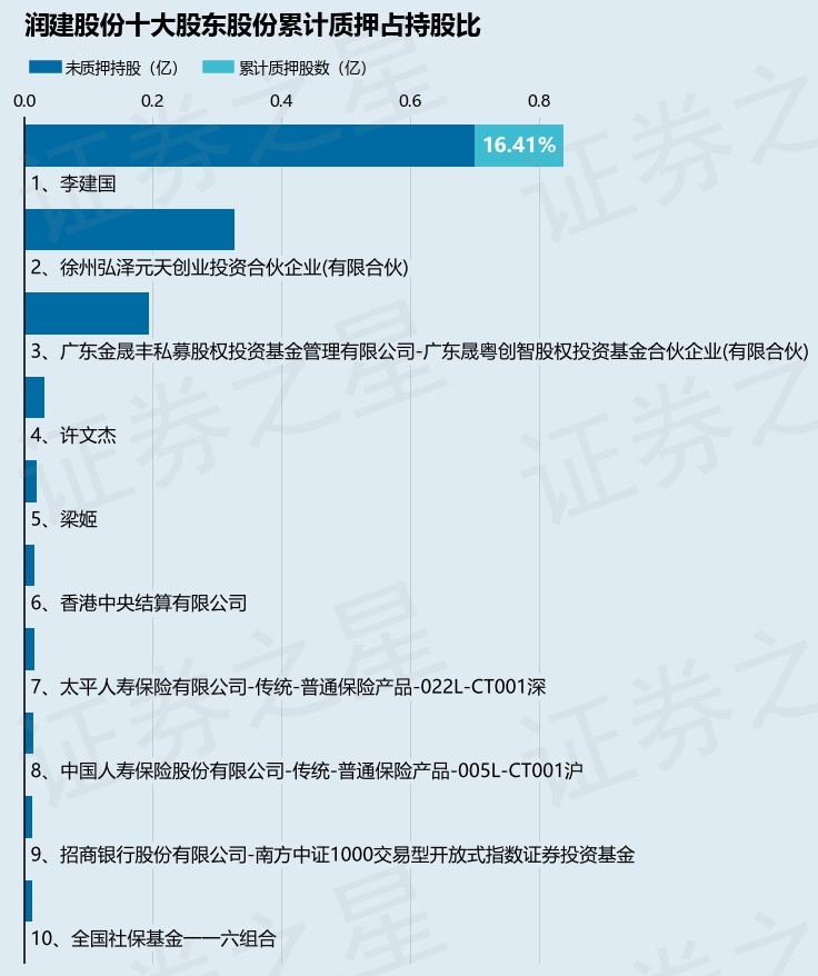 截止本公告日,股东李建国已累计质押股份1375.0万股,占其持股总数的16.41%。本次质押后润建股份十大股东的累计质押股份占持股比例(占持股比例的计算以公司最新一期财务报表公布的十大股东的持股总数为基准)见下图: