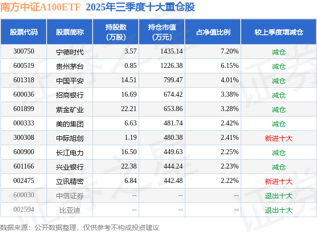 南方中证A100ETF基金成立于2024年12月19日,基金经理为龚涛,基金跟踪标的为中证A100指数,成立以来超额回报为2.32%,近一个月超额回报为0.33%。最新披露的基金持仓数据显示,截止2025年9月30日,该基金第一大重仓股为宁德时代(300750),持股占比为7.2%。